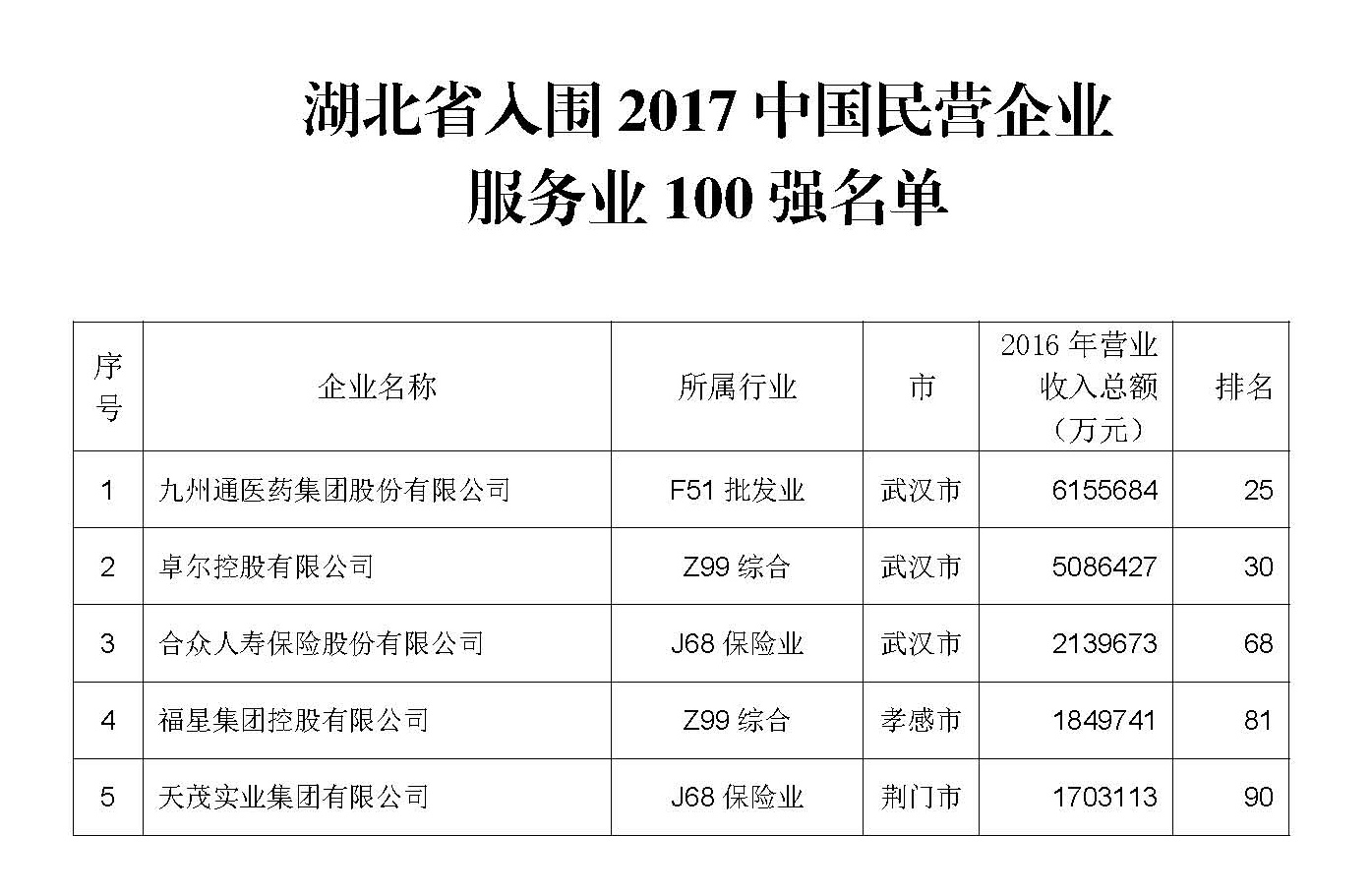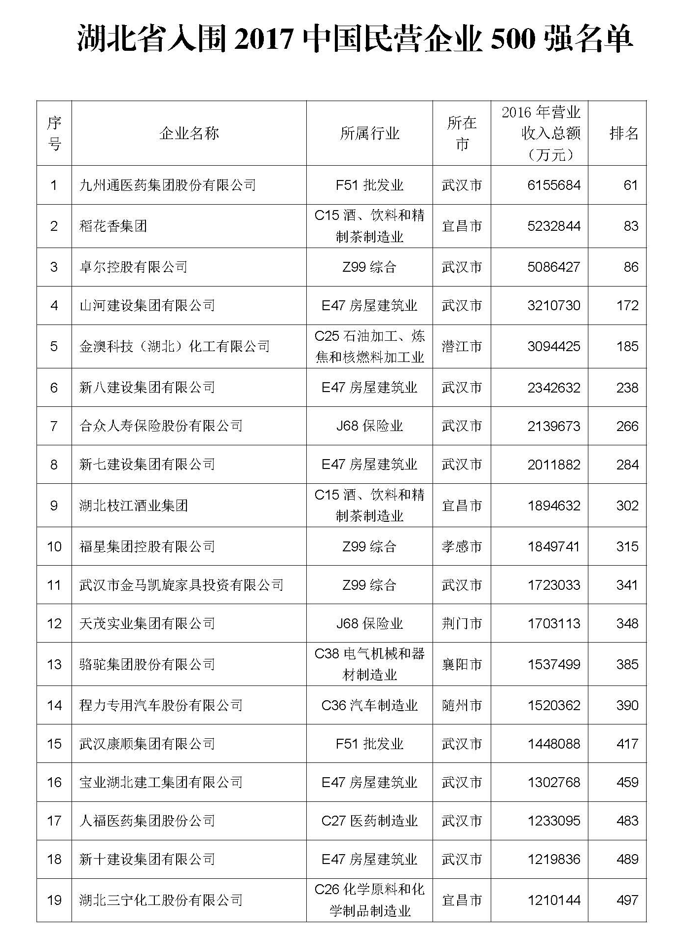 从今天(8月24日)上午全国工商联发布的2017中国民营企业500强名单中获悉,我省有19家民营企业入围,入围企业数量中部第一,全国第五。九州通医药集团、稻花香集团、卓尔控股三家企业进入前100强,分别位列500强第61、83、86位。合众人寿、天茂实业集团、人福医药集团三家民营企业首次进入500强。