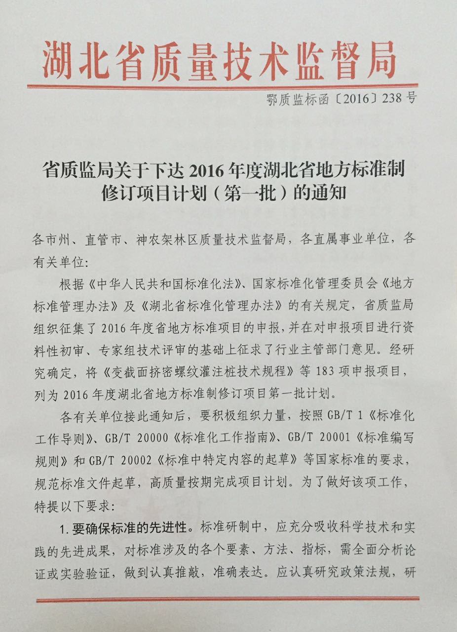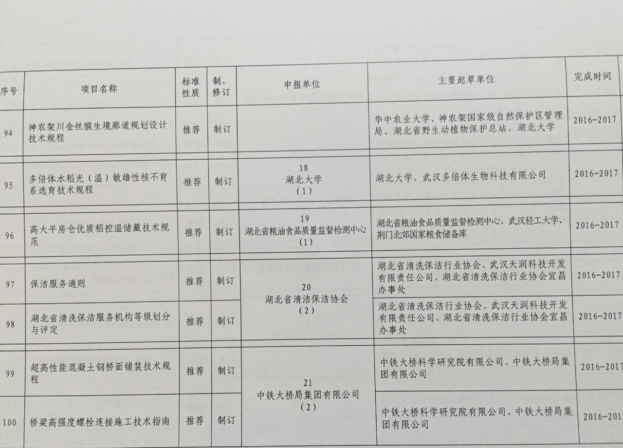 根据《中华人民共和国标准化法》、国家标准化管理委员会《地方标准》管理办法》及《湖北省标准化管理办法》的有关规定,省质监局组织征集了2016年度省地方标准项目的申报,并在对申报项目进行资料性初审、专家组技术评审的基础上征求了行业专管部门意见。经研究决定,其中183项申报项目,列为2016年度湖北省地方标准制修订项目第一批计划,我会申报的《湖北省清洗保洁服务机构等级划分与评定》《保洁服务通则》位列其中第97、98,是审报的第二十个单位,紧随省直机关单位和部级单位后。