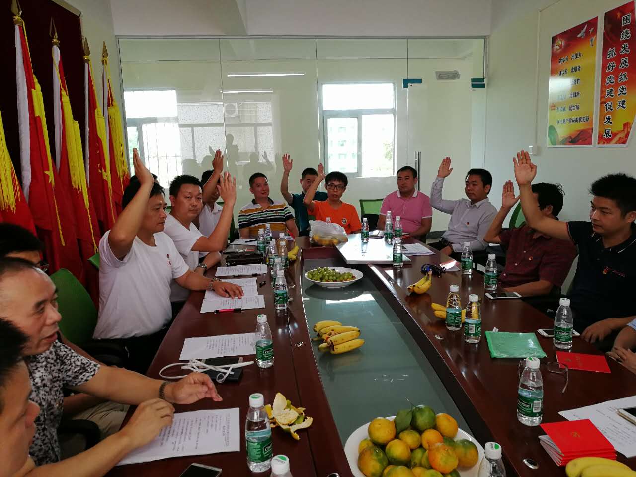 为庆祝建国68周年,喜迎党的十九大召开,9月24日上午,中共广东省湖北阳新商会深圳办事处支部委员会在宝安区松岗街道召开“两学一做”学习教育暨党建专题工作会议,支部全体党员集中学习党章、重温党的历史,重点围绕商会年度党建工作计划落实情况展开讨论,同时,双方就以党建带动商会会员积极参会商会工作、参观红色教育基地、建设党建活动室等事项发表意见。同时在会议上,宣读了阳新县委组织部关于柯美顺、陈绪文两位同志预备党员转正的相关文件以及支部大会通过接收柯亨金同志成为预备党员的决议。
