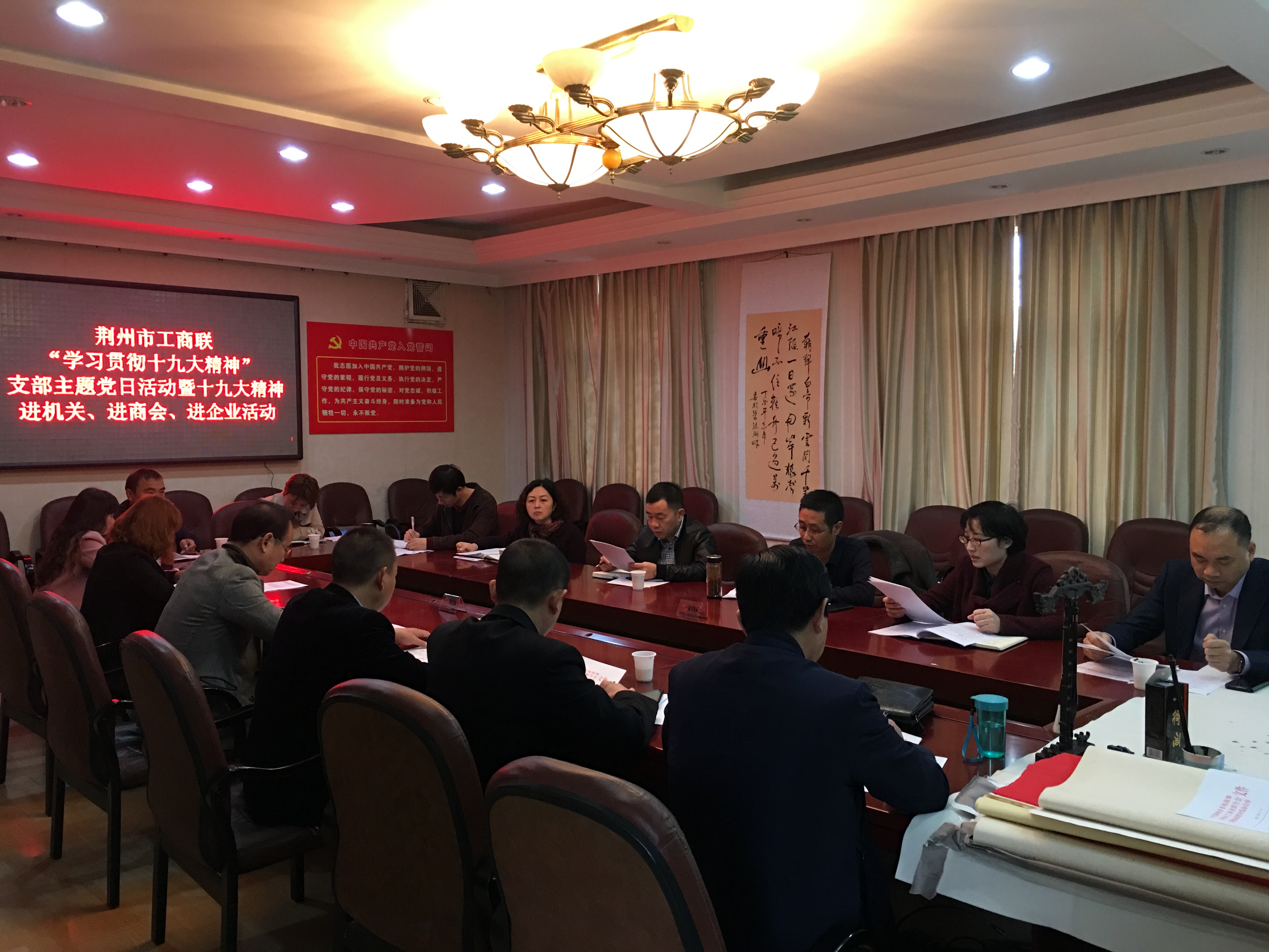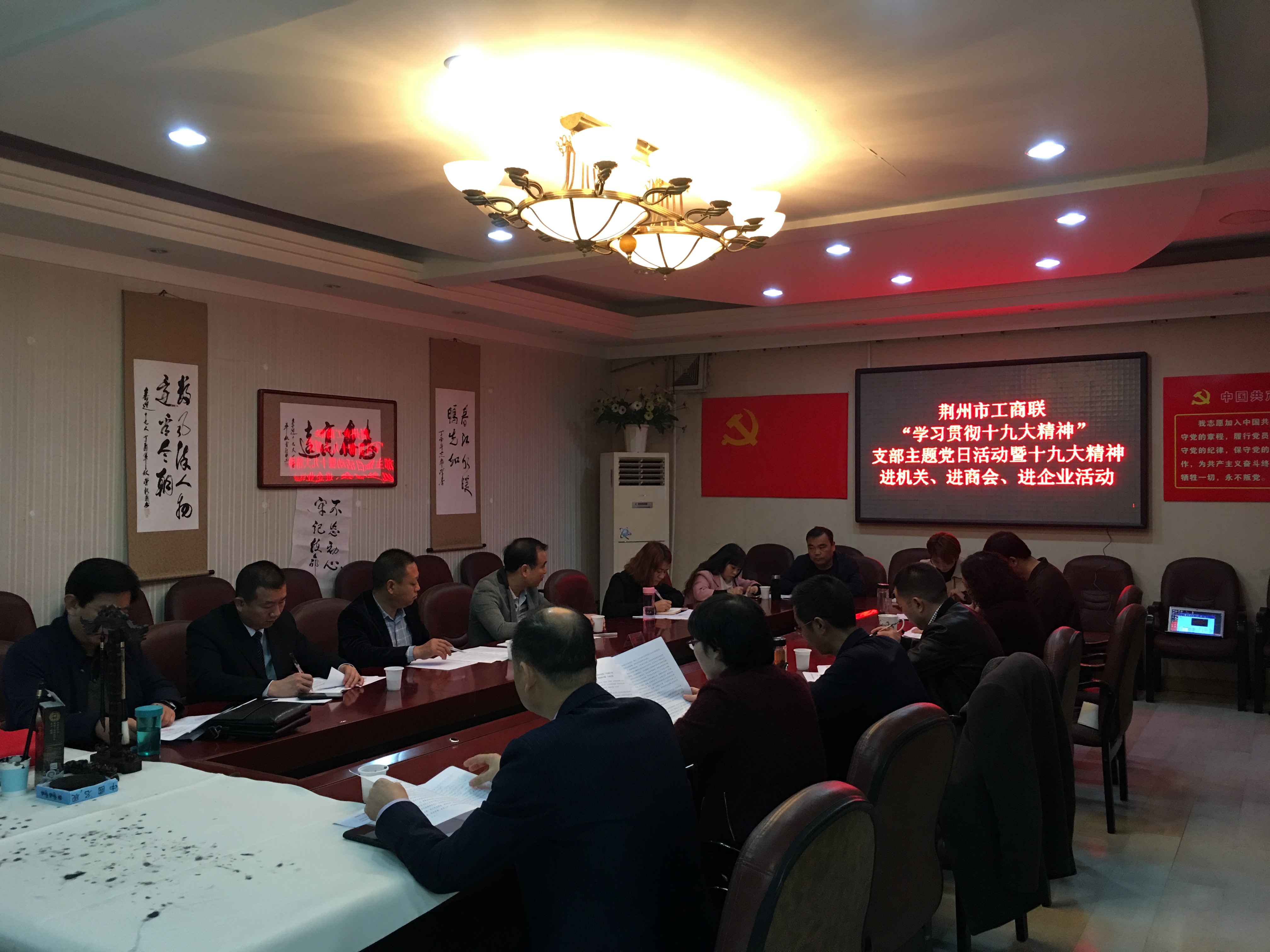 2017年11月10日上午,荆州市工商联在机关三楼会议室召开市工商联系统“学习贯彻十九大精神”支部主题党日活动暨十九大精神进机关、进商会、进企业活动。市工商联在家党员干部和5个直属商会、2个直属会员企业党组织负责人共15人参加活动。