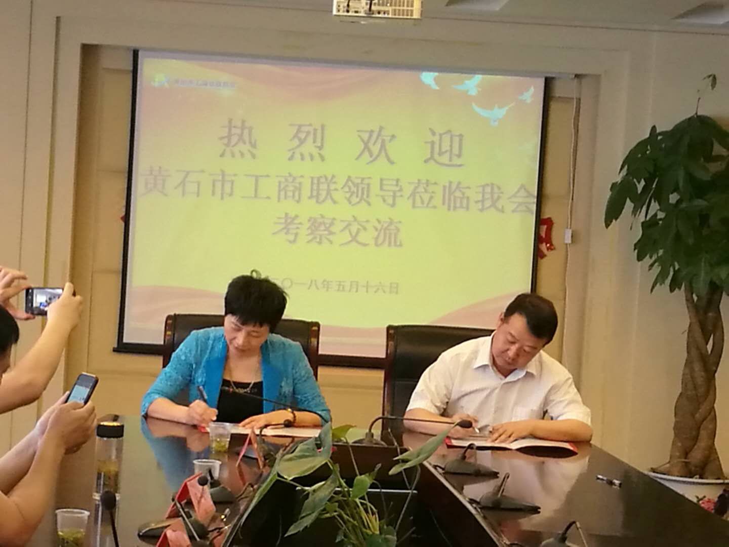 座谈结束后梁鹤林和刘海英代表双方签订友好商会协议书,促进两市工商联和企业的交流合作,共促两地发展。