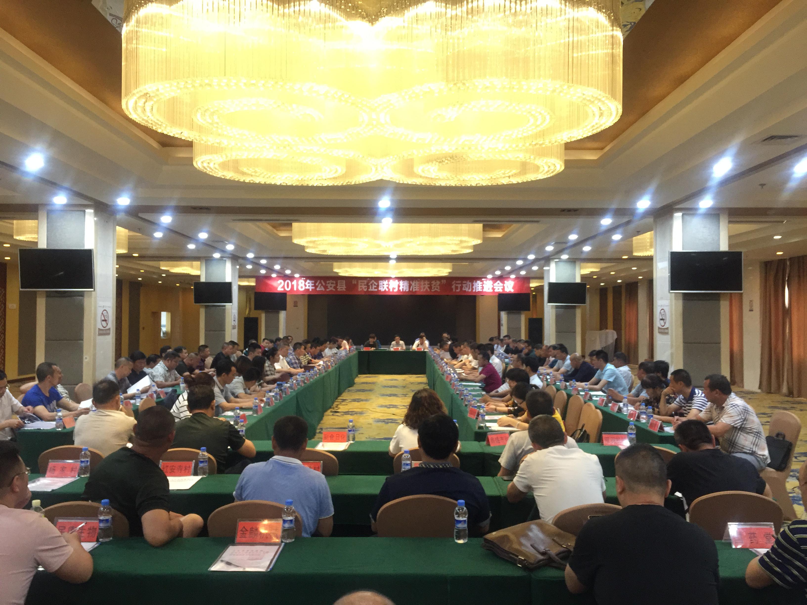 5月29日下午,公安县“民企联村精准扶贫”行动推进会议在三袁国际大酒店召开。公安县委常委、统战部部长张砚堂同志出席会议并讲话。全县49个建档立卡贫困村的支部书记、所在乡镇的统战委员,参与帮扶建档立卡贫困村的企业负责人,县委统战部、县工商联、县扶贫办部分机关干部130余人参加会议。